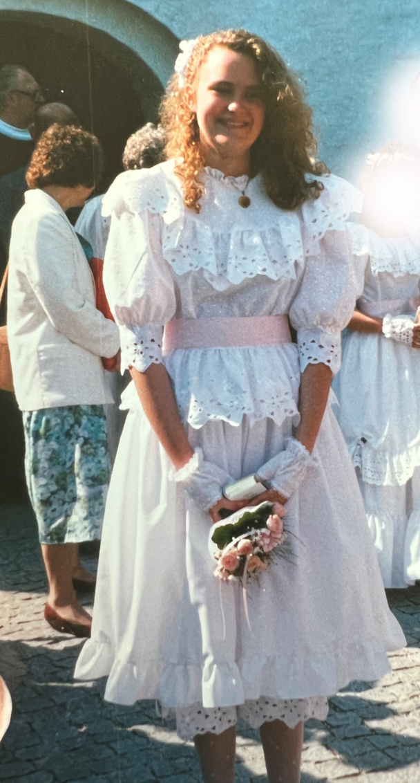- Min mosters brudekjole blev syet om til konfirmationskjole til min ældste søster i 1986, så havde min anden søster den på i 1988, og så blev det min tur i 1994. Min mor insisterede på, at vi skulle have samme kjole på, og så fik vi lov til selv at vælge farvet silkebånd. Dengang syntes jeg, det var virkelig træls, men i dag elsker jeg hendes beslutning. Det bandt os søstre sammen, og det viste en respekt og en ydmyghed over for de ressourcer, der var at gøre med. Vi havde ikke mange penge, men min mor havde sparet sammen, siden vi blev født. Da min bror blev konfirmeret i 2002 fik han også kjolen på - dog kun kortvarigt til festen efter kirken. Jeg har kjolen hængende og vil da se, om jeg kan overtale min datter til at have den på om syv år.